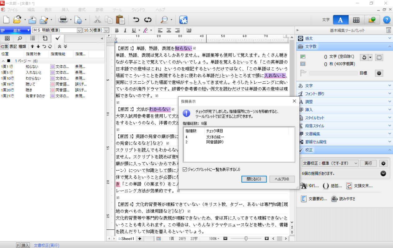 校正ソフトというと、JUSTSYSTEMのJust Right!などが有名ですが、かなり高額なソフトです。そこで代替案。同じくJUSTSYSTEMのワープロソフト「一太郎」の校正機能をおすすめします。こちらはMicrosoft Wordの校正機能よりも高機能です。文書の誤字・脱字や仮名遣い、表記の統一、英単語のスペルなどが確認できます。